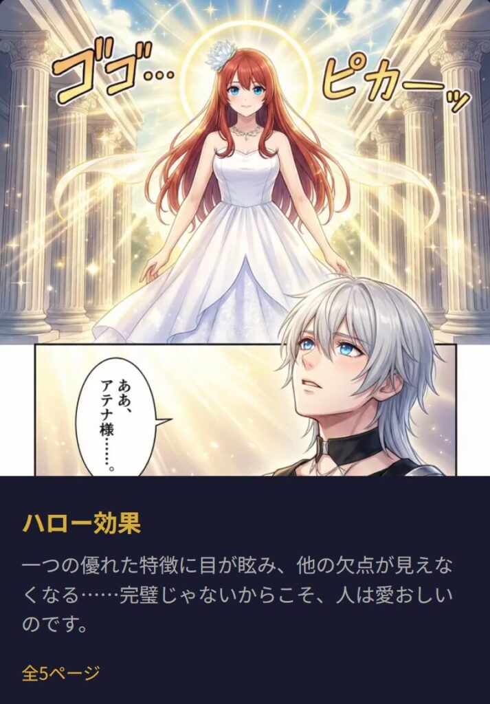 「ハロー効果とは、ある人の目立つ特徴に引きずられて、その人全体の評価が変わってしまう心理現象のことですわ」アテナは説明しました。「例えば、パリッとしたスーツを着ている人を見ると、『仕事ができそう』『信頼できそう』と感じませんか?」