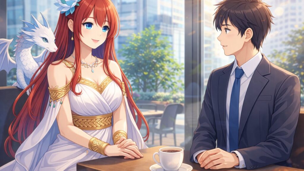 アテナは次元転移の力を使い、タクミが一人でコーヒーを飲んでいるカフェへと降り立ちました。エレガントな白いドレスに身を包んだ彼女からは、温かな幸せのオーラが溢れ出しています。